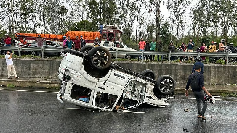 The vehicle was following D K Shivakumar’s car as he was returning to Bengaluru after participating in the Saadhana Samavesha event in Mysuru on Saturday when it overturned, allegedly due to the driver losing control.
