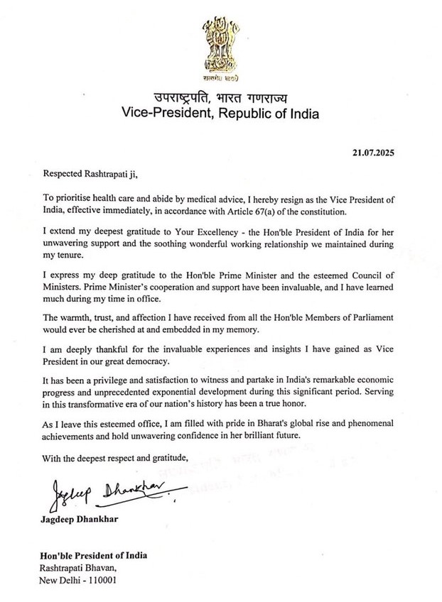 “To prioritise health care and abide by medical advice, I hereby resign as the Vice President of India, effective immediately… in accordance with Article 67(a) of the Constitution.”