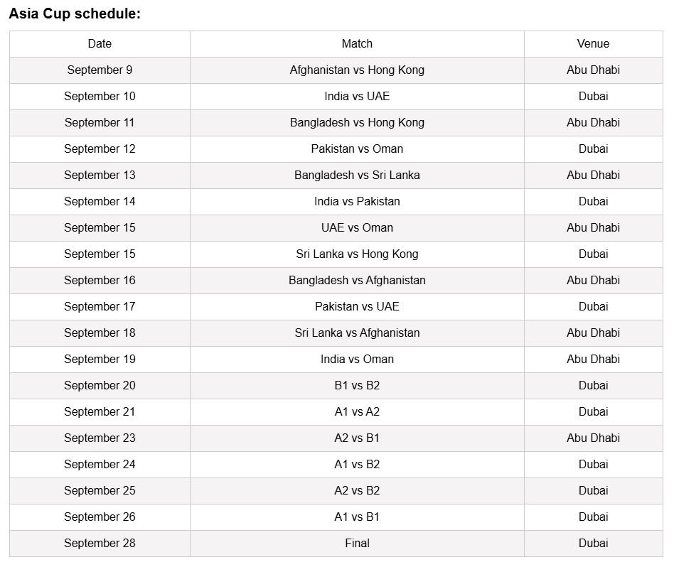 A total of 19 T20 International matches are set to be played, featuring eight teams divided into two groups. Notably, 11 matches, including the marquee India vs Pakistan clash on September 14 and the tournament final on September 28, will be played at the Dubai stadium, while Abu Dhabi will host 8 matches, including a Super Four fixture on September 23.