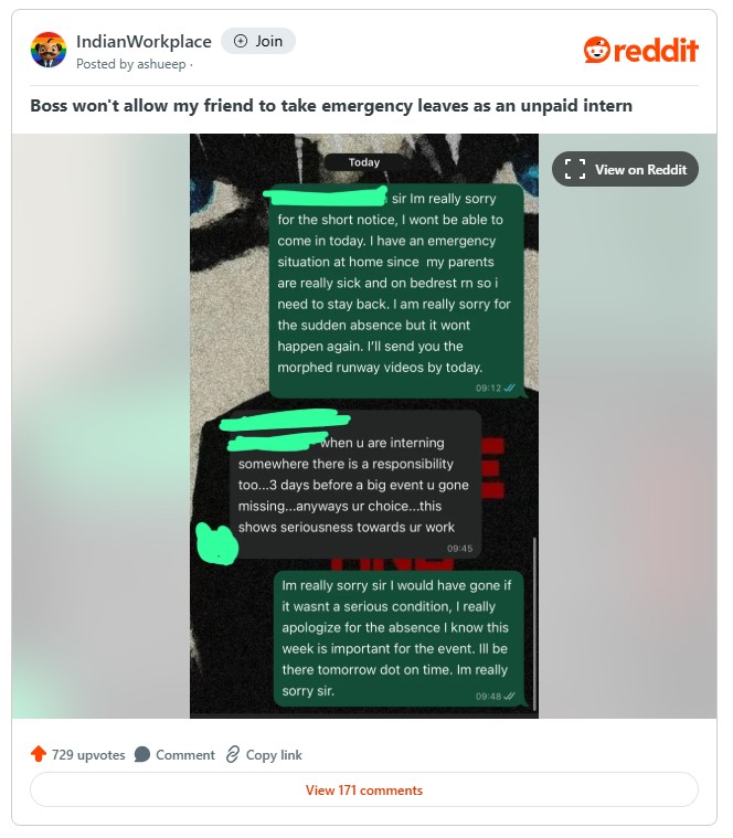 The post, titled “Boss won’t allow my friend to take emergency leaves as an unpaid intern”, included a screenshot of the conversation between the intern and their boss. In the chat, the intern politely explained the emergency situation, stating, “Sir, I’m really sorry for the short notice. I won’t be able to come in today as my parents are really sick and on bedrest. I need to stay back. I’ll send you the morphed runway videos by today.”