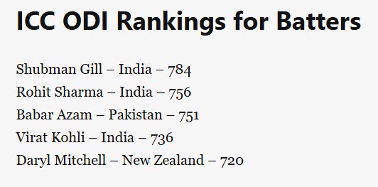 Currently, Rohit has 756 ranking points, surpassing Babar’s 751. Shubman Gill continues to lead the table with 784 points, while Virat Kohli is placed fourth with 736 points. New Zealand’s Daryl Mitchell completes the top five with 720 points.