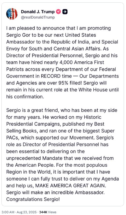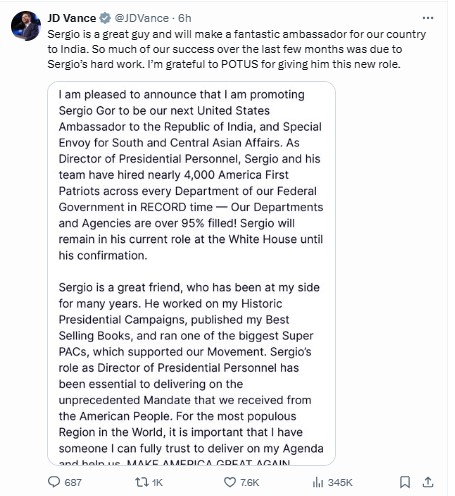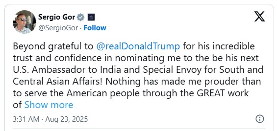 US Vice President JD Vance expressed confidence in Gor’s appointment, calling him a “fantastic ambassador” and crediting much of the administration’s recent success to Gor’s efforts in the White House. “Sergio is a great guy and will make a fantastic ambassador for our country to India. I’m grateful to POTUS for giving him this new role,” Vance wrote on X (formerly Twitter).