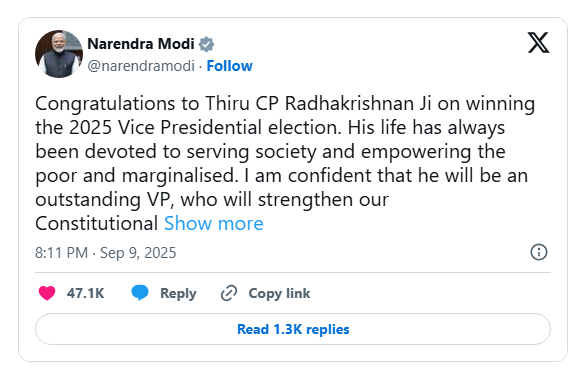 Prime Minister Narendra Modi also lauded Radhakrishnan’s dedication to empowering marginalised communities, describing him as an “outstanding Vice President” who would strengthen Constitutional values and enrich parliamentary discourse.