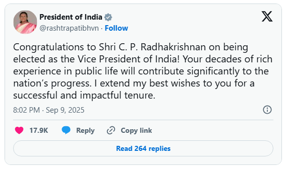 President Droupadi Murmu congratulated Radhakrishnan, highlighting his vast experience in public life and expressing confidence that his leadership would contribute meaningfully to the nation’s progress.
