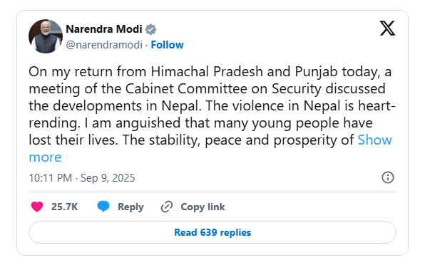 In a post on X, Modi described the violence as “heart-rending” and expressed anguish at the loss of young lives. Appealing directly to the people of Nepal, he urged them to rise above anger and division and support peace, unity, and stability.
