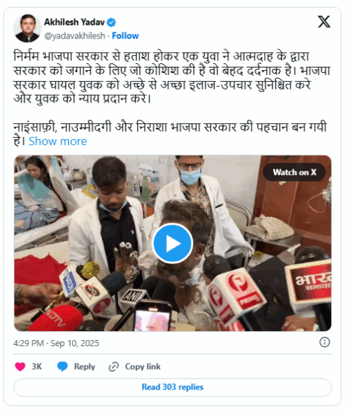 Reacting to the incident, SP president Akhilesh Yadav accused the ruling BJP government of fostering an environment of despair and demanded quality medical treatment and justice for the victim.