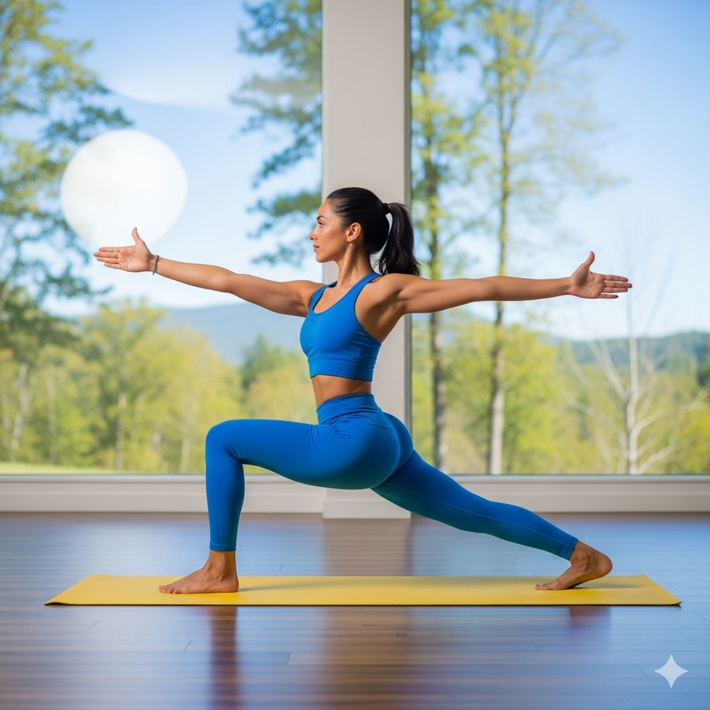 Step one foot forward into Warrior I, arms raised. Then shift to Warrior II with arms stretched sideways. These poses strengthen legs, open hips, and build stamina.