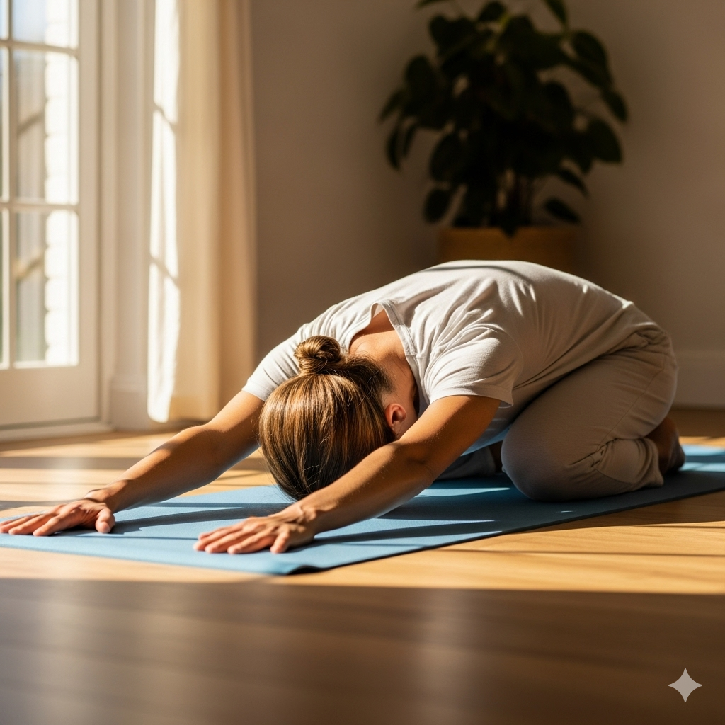 Sit back on the heels, forehead resting on the mat, arms extended. A grounding pose that calms the mind and restores energy.