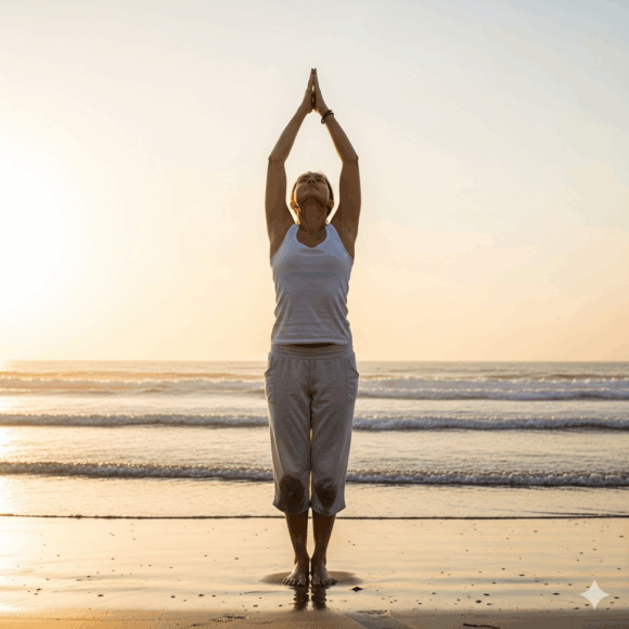 Stand tall with feet together, palms at the heart centre, and shoulders relaxed. This simple pose builds awareness of posture and sets an intention for the practice.