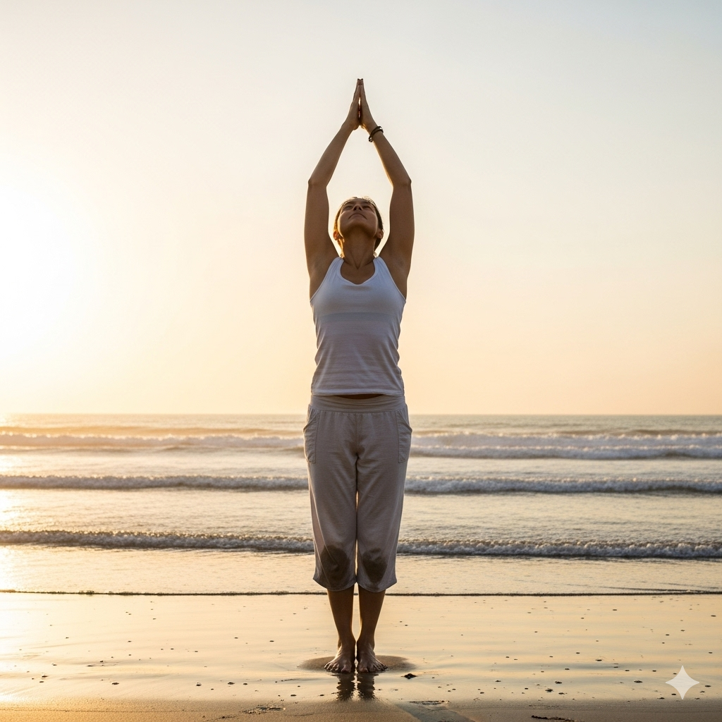 Upward Salute (Urdhva Hastasana)                                                                                                                                                                                                                                                                  Inhale deeply, raise arms overhead, and gently arch back. This opens the chest and lungs while improving blood circulation.Standing Forward Bend (Uttanasana)