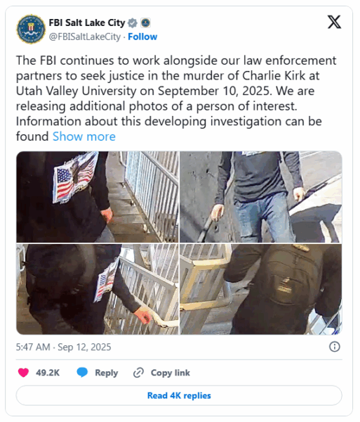 The FBI had previously released images of a person of interest linked to the assassination, seeking public assistance in identifying the suspect, who was described as wearing a cap, black sunglasses, a long-sleeved black T-shirt, and jeans.