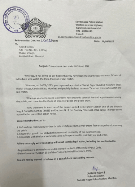 Mumbai Police have issued a preventive action notice to Shiv Sena (UBT) spokesperson Anand Dubey after a viral video showed him smashing a television and threatening to break TV sets of anyone broadcasting the India-Pakistan Asia Cup match.