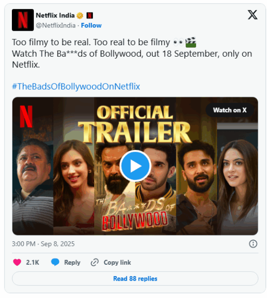 Netflix shared the trailer on X, captioning it, “Too filmy to be real. Too real to be filmy 👀🎬 Watch The Ba***ds of Bollywood, out 18 September, only on Netflix.” The series promises a gripping narrative that delves into the glamour, ambition, and struggles behind the scenes of Bollywood.