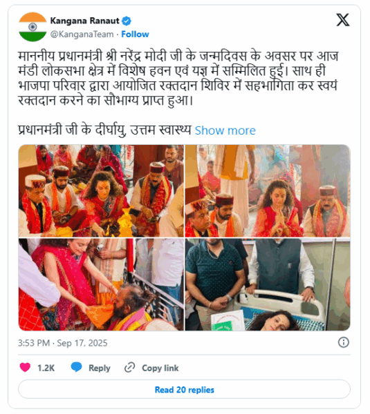 Sharing the moments on X (formerly Twitter), Kangana wrote in Hindi, “On the occasion of Hon’ble Prime Minister Shri Narendra Modi Ji’s birthday, I participated in a special havan and yagna held in the Mandi Lok Sabha constituency. Along with this, I had the privilege of taking part in a blood donation camp organized by the BJP family and also donated blood myself.”