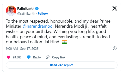 Superstar Rajinikanth also extended his greetings, posting on X, “To the most respected, honourable, and my dear Prime Minister @narendramodi Narendra Modi ji, heartfelt wishes on your birthday. Wishing you long life, good health, peace of mind, and everlasting strength to lead our beloved nation. Jai Hind.”