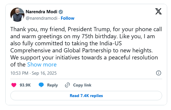 Earlier in the day, President Trump personally called Prime Minister Modi to wish him on his 75th birthday. Modi, in response, shared a post on social media thanking Trump for his warm wishes and reaffirming India’s commitment to strengthening the India-US Comprehensive and Global Partnership.