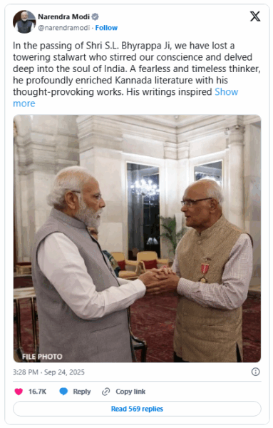 Paying tribute, Prime Minister Narendra Modi expressed condolences, calling Bhyrappa a “towering stalwart who stirred our conscience and delved deep into the soul of India.” Modi added that Bhyrappa’s fearless and timeless thoughts had inspired generations to reflect, question, and engage more deeply with society.